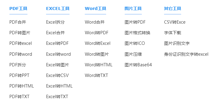 在线PDF转换,集合了多个实用办公工具为一体,而且完全免费!!!PDF转换成Word、Excel、PPT、HTML;音视频格式之间的转换;图片格式转换与处理;
