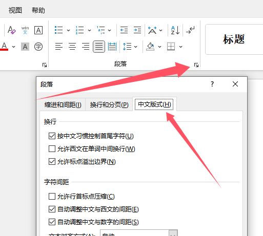 (2)点击“开始”选项卡,找到“段落”组中的“中文版式”按钮。