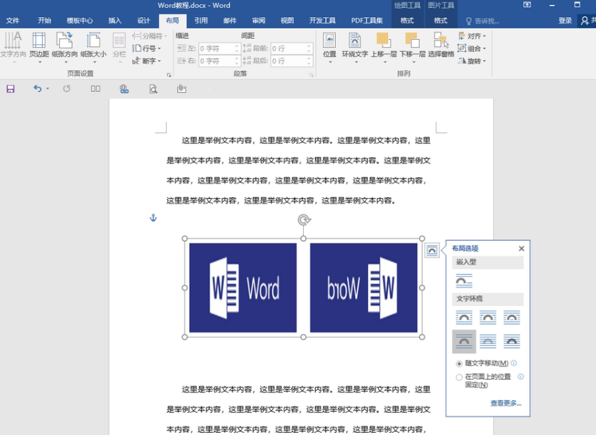 右键点击图片,选择“格式”,然后在“图片格式”菜单中,找到“文字环绕”选项,选择“浮于文字上方”。