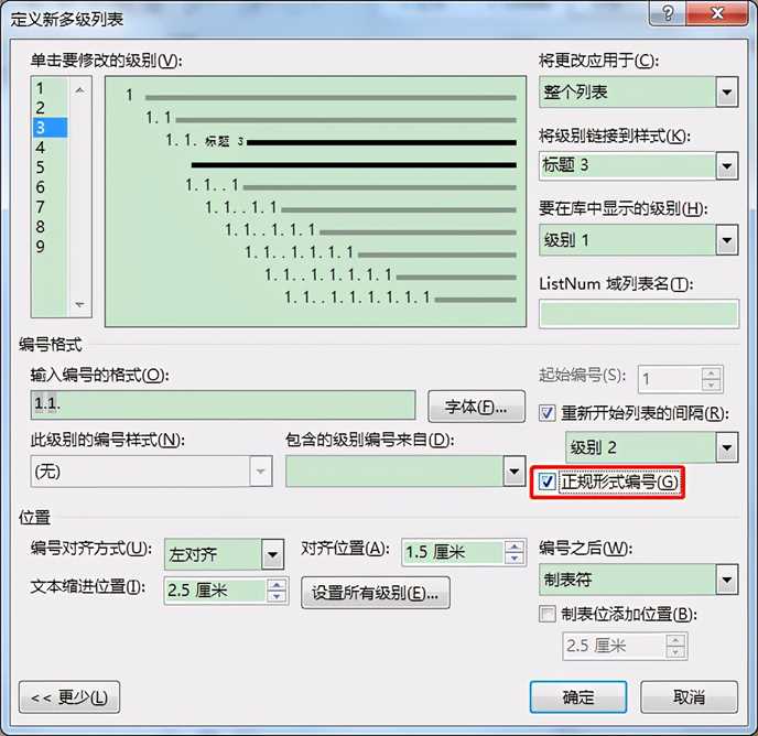 最佳答案多级列表问题一、某个级别的编号样式无法选择或变更下图中,当前要设置“3”级编号样式,但是窗口中“此级别的编号样式”编辑框下拉列表无法展开进行选择或变更。解决办法:取消勾选窗口右侧“正规形式编号”选项,此时,“此级别的编号样式”编辑框下拉列表即可正常......