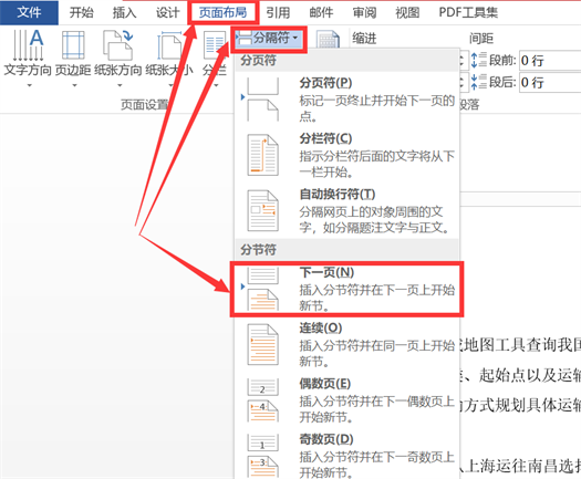 ✿ 步骤一:首先要将鼠标光标移动到文档页面最开始的地方,点击【页面布局】-【分节符】-【下一页】;