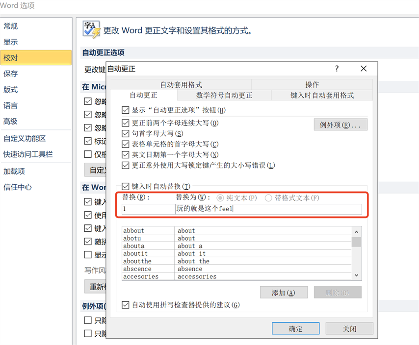 然后我们在红色框中输入替换为:1,替换为”玩的就是这个feel”,再点击”添加后”,一路确定确定再确定,这时候我们在文档中输入数字1,然后按回车键,看看会发生什么?