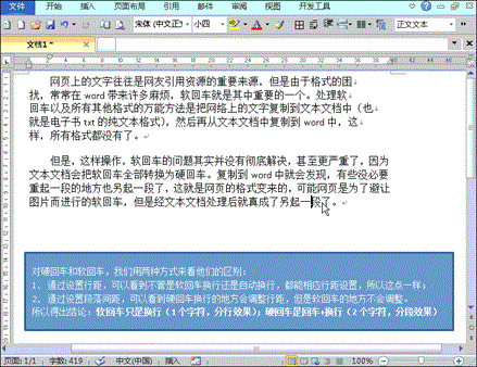得出结论:软回车只是换行(1个字符,分行效果);硬回车是回车+换行(2个字符,分段效果)