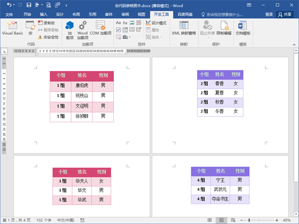 最佳答案实例展示下图文档一共有四页,每页有一个表格,表格的对齐方式为右对齐或者左对齐。接下来我们想将所有的表格批量设置为居中对齐。在实际工作中,我们的文档中可能会有更多的表格,下文演示过程中的代码同样适用。操作步骤1.在Word编辑窗口上方的“开发工具”选项卡“代码”功能......