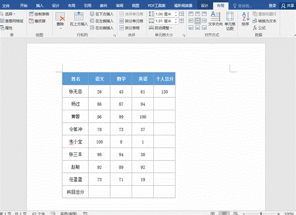 可以看到,我们在Word里成功地对各个科目的分数进行了求和计算,最终结果如下:
