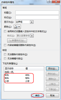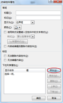 然后继续点击【添加】,将下拉列表内容都添加好后,在【内容控件属性】对话框中点击【确定】