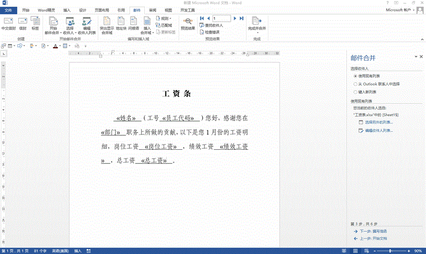 首先我们要了解的是,邮件合并本意是以固定的模板插入变化的字段信息并批量生成文件,生成的结果可以批量打印或者进行邮件发送。在实际使用过程中,邮件发送的比较少,更多是生成文件。比如这份工资单,我们有一个现成的表格,需要将这些信息分别插入到Word模板的横线处,下面开始操作。