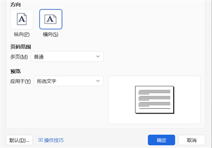 当文档内容已经编辑完成,仅需要将包含横向表格的部分内容所在的页面设置为横向时,可采用选中内容设置法。选中目标内容后,进入「页面」-「页面设置」,把“纸张方向”修改为「横向」,在“应用于”选项中选择「所选文字」,点击确定后,包含所选内容的页面就会变为横向。
