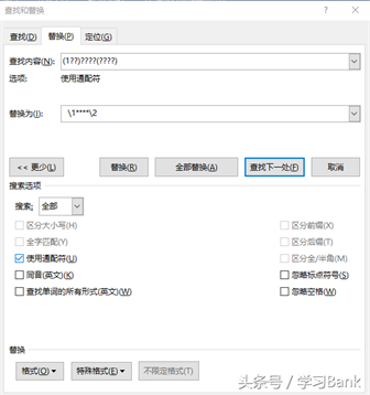 3、点击左下方的“更多”按钮,勾选“使用通配符”复选,在“替换为”输入框中输入“1****2”;