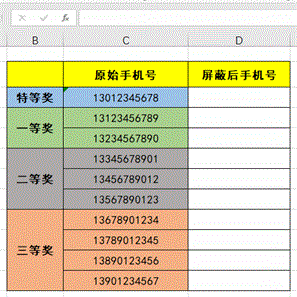 * 案例中,C3单元格为原始手机号,D3单元格为屏蔽后的手机号,函数的功能是将C3单元格中的手机号从第4位数字开始连续4位用*取代,达到屏蔽的效果。
