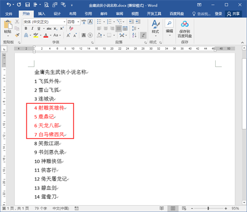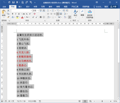 下图Word文档中显示了金庸先生的14部武侠小说名称,当前红色字体显示部分的顺序是错乱的,接下来我们想让所有武侠小说的名称按最前面的数字依次升序排列。