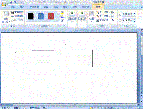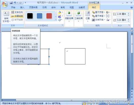 2、然后,选中其中一个文本框,进入【格式】标签。在【文本】选项组里,点击【创建连接】按钮。这时,会出现一个类似水壶的标志,点击另一个文本框即可。