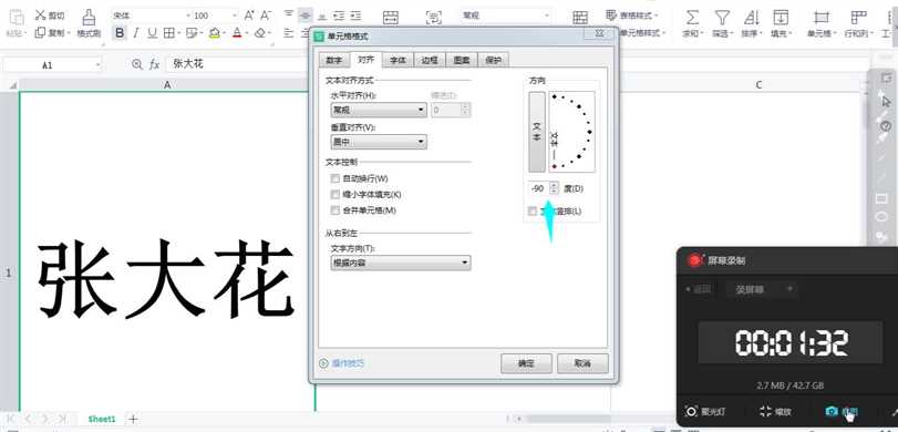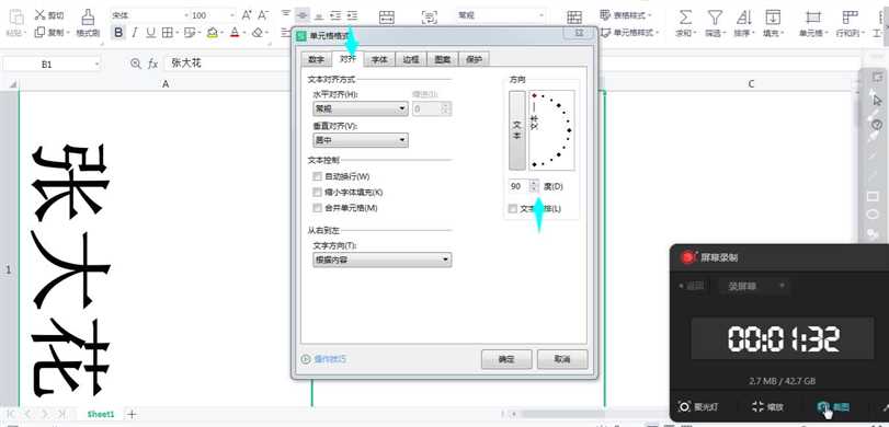 同样的方法鼠标Ctrl 1设置单元格格式,将第二列对齐方向设置为正90度