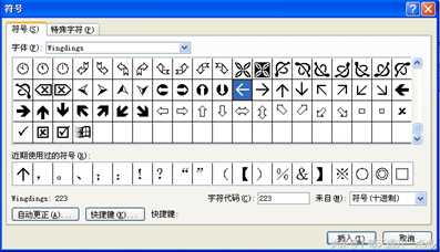然后,弹出“符号对话框”,在字体处输入Wingdings,插入所需箭头符号即可。