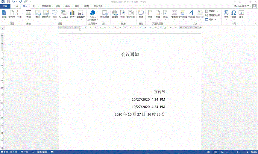 首先来看一下通过插入选项卡插入的情形。打开插入选项卡下文本选项中的日期和时间,这时会跳出来一个对话框,里面有很多样式,还可以通过中文与英文切换,选择符合你要求的样式。在右下角还有全角字符和自动更新的选择,我们先不管这两个选项,先插入英文格式日期和时间,这个时候插入的是一个不可更新的文本字符串。假如我们点击了右下角的自动更新,再插入日期和时间,发现英文格式下的日期和时间都有自动更新的按钮,而中文的样式没有,目测自动更新只适用于英文版。而勾选了自动更新的中文版日期和时间表面上看不能自动更新,实际上是通过右键的“更新域”来实现的。