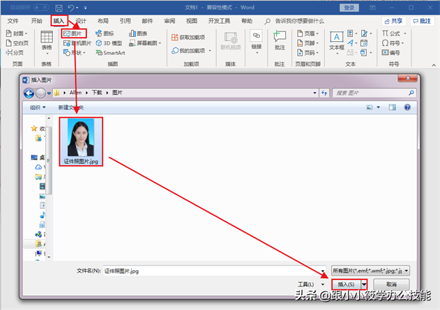 4、点击菜单栏的“插入”选项卡 — 点击“图片” — 弹出“插入图片”对话框 — 选中要插入的图片 — 点击“插入”按钮。