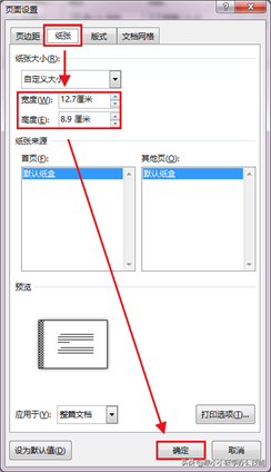 2、弹出“页面设置”对话框 — 将宽度设置为“12.7厘米” — 高度设置为“8.9厘米”。