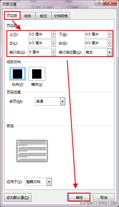 3、切换到“页边距”选项卡 — 将页边距的上下左右值都设置为“0.5厘米” — 将“装订线”的值设置为“0厘米” — 点击“确定”按钮。