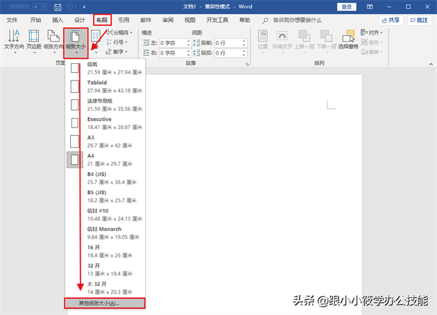1、新建一个空白的Word文档 — 点击菜单栏的“布局”选项卡 — 在“页面设置”工具组中点击“纸张大小” — 在下拉菜单中选择“其他纸张大小”。