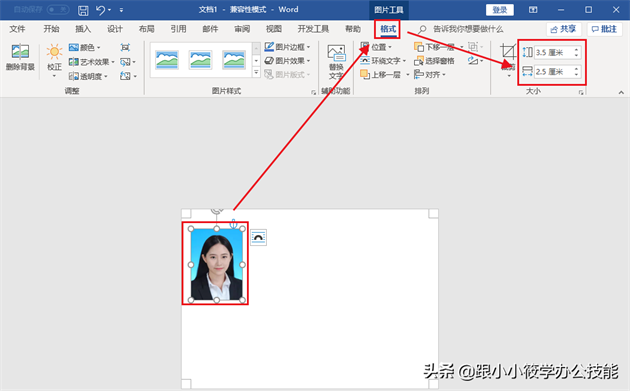 5、选中图片 — 点击菜单栏的“格式”按钮 — 点击“裁剪” — 将图片裁剪为高3.5厘米、宽2.5厘米大小的1寸证件照。