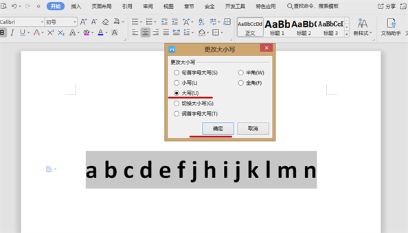 选中英文字母,点击开始→点击文字后面的倒三角符号→选择更改大小写(C)→点击大写(U),点击确定就OK了。