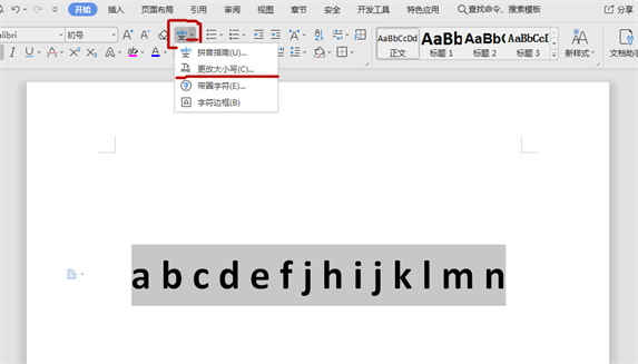选中英文字母,点击开始→点击文字后面的倒三角符号→选择更改大小写(C)→点击小写(L),点击确定就OK了。