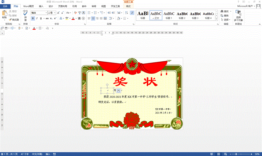 这样就编辑完成了,可以浏览一下看看效果,每个人的奖状都是单独成页显示,直接用特定的纸张彩色打印就可以使用了。