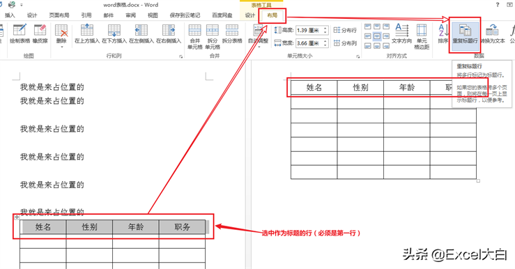 然后,点击【布局】标签下的“重复标题行”按钮。