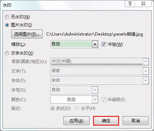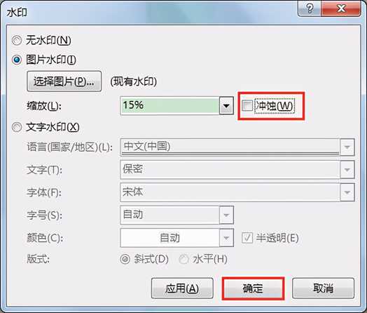如果希望图片水印能显示得更清晰一些,可在“水印”对话框中取消勾选“冲蚀”,再单击“确定”。
