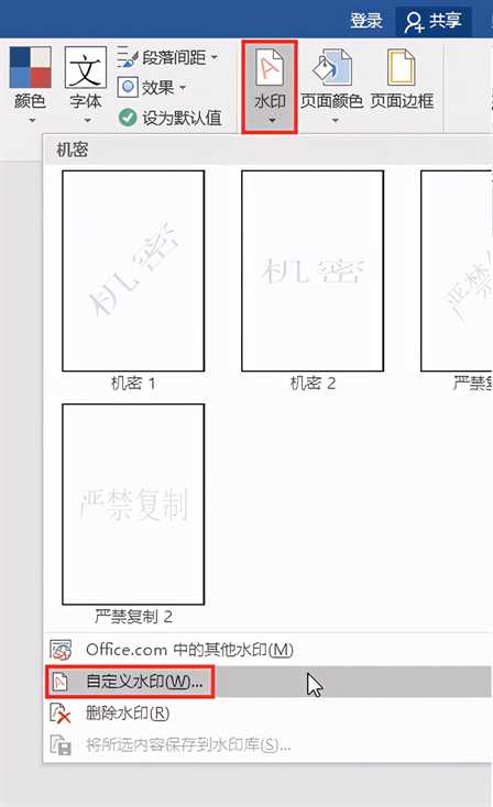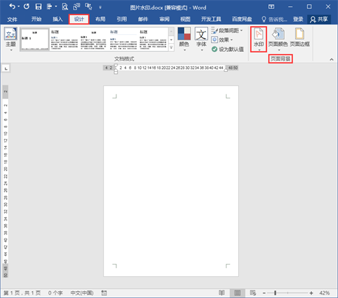 1.打开要添加图片水印的文档,在“设计”选项卡“页面背景”功能组中单击“水印”按钮,在弹出的下拉列表中选择“自定义水印”。