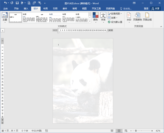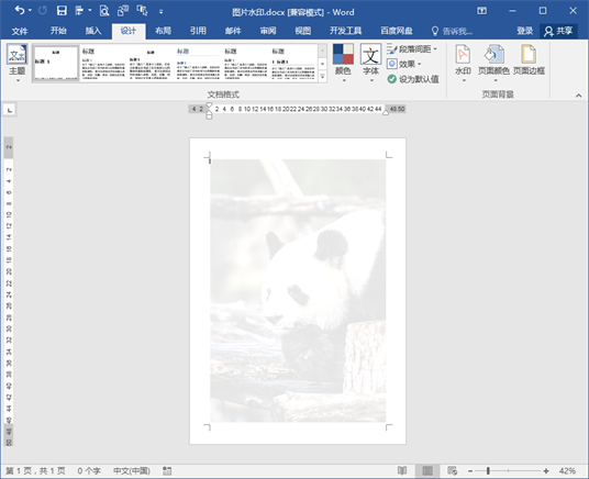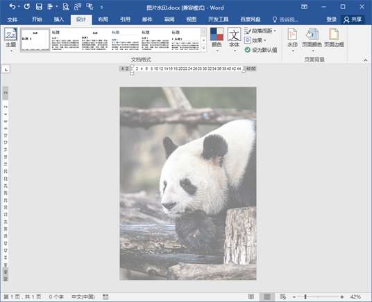 5.返回“水印”对话框,单击“确定”按钮,此时文档页面中已经出现了熊猫图片水印,不过图片水印并未铺满整个页面,如果想让图片铺满整个页面,需要对水印图片进行“缩放”调整。