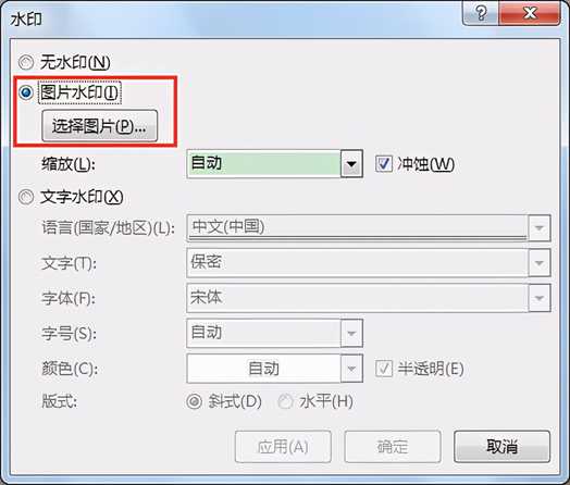 2.在弹出的“水印”对话框中选择“图片水印”,单击“选择图片”按钮。