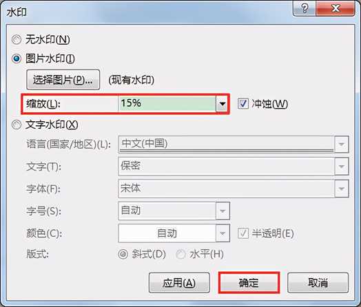6.再次打开“水印”对话框,适当调整“缩放”参数数值,这里设为“15%”,单击“确定”。