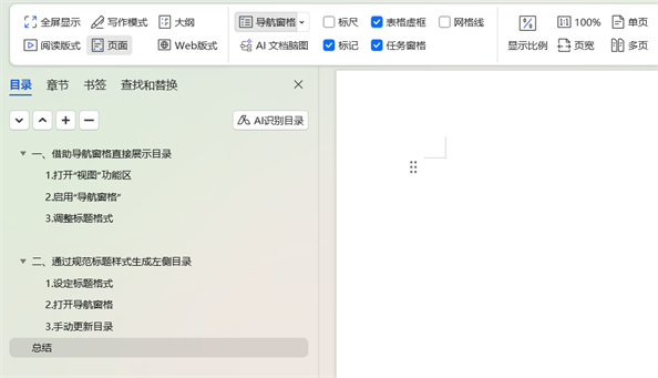 - 启用“导航窗格”:在“视图”选项卡的“显示”分组里,找到“导航窗格”并勾选。此时文档左侧会自动弹出一个面板,这就是用于显示目录的导航窗格。