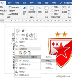 5、在查看Word文件时,想要查看该演示文稿,双击演示文稿即可开始播放。若想要对Word文件显示的PowerPoint演示文稿进行修改,右键单击PowerPoint演示文稿,在弹出的快捷菜单中依次选择“Presentation对象–编辑”选项,Word文件界面转换到“插入PowerPoint演示文稿”界面,即可对PowerPoint演示文稿进行修改。