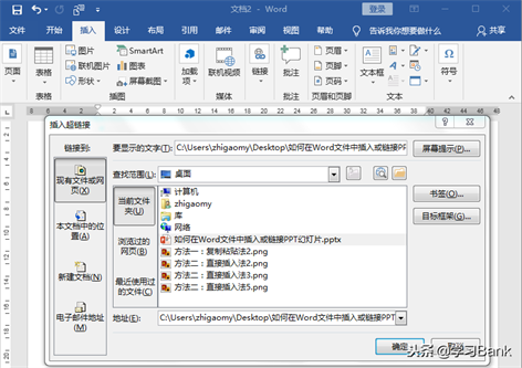 2、弹出“插入超链接”对话框,选择需要链接的PowerPoint演示文稿对象。可在“插入超链接”对话框中的“查找范围”文本框中缩小查找范围,选定后单击“确定”按钮。