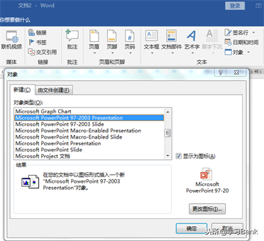 2、打开“插入对象”对话框,选择“Microsoft PowerPoint演示文稿”选项并单击“确定”按钮。