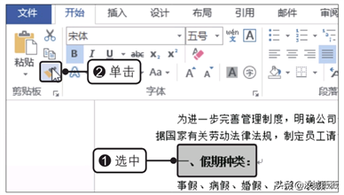 打开原始文件,①选中已经设置了格式的文本,②在“开始”选项卡下的“剪贴板”组中单击“格式刷”按钮,如下图所示。