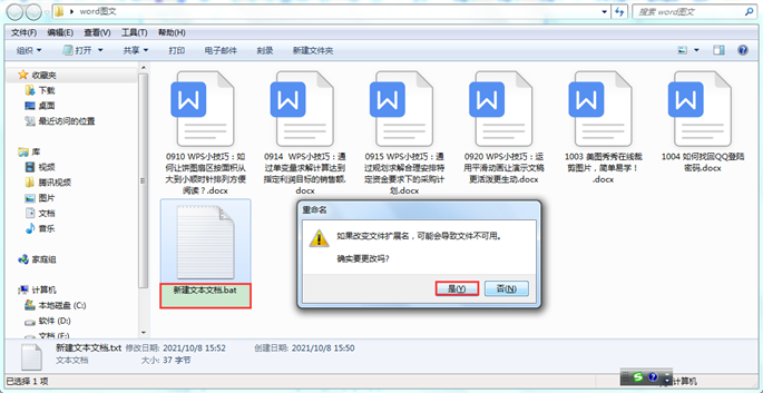 4.关闭文本文档,将其扩展名由“.txt”改为“.bat”,并在“重命名”对话框中单击“是”按钮。