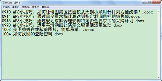 6.双击打开文件“src.txt”,可以看到文件夹中所有Word文档的名称已经全部提取出来了。
