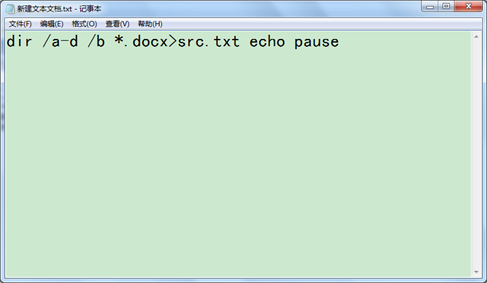 3.打开新建的文本文档,在其中输入如下字符串:dir /a-d /b *.docx>src.txt echo pause。