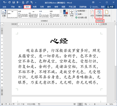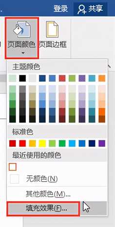 2.在“设计”选项卡“页面背景”功能组中单击“页面颜色”按钮,在弹出的下拉列表中,选择“填充效果”。