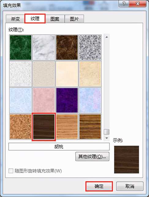 3.在弹出的“填充效果”对话框中切换到“纹理”选项卡,在“纹理”列表中选择一种合适的纹理样式,这里选择“胡桃”纹理,单击“确定”。