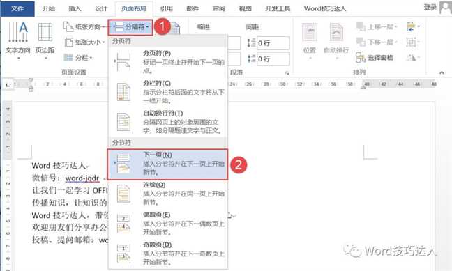 定位到需要换页的位置后,单击【页面布局】选项卡-【页面设置】功能组中的【分隔符】,选择分页符【下一页】,Word就会在当前位置添加了一个分页符。