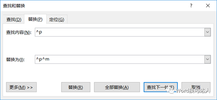 按【Ctrl H】快捷键调出【查找和替换】对话框,查找:^p(段落标记),替换为^p^m