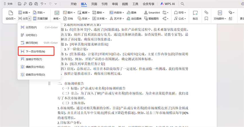 适用场景:当需要在同一页中区分不同的内容模块,并且这些模块需要不同的格式时,比如在简历中,个人信息部分之后是工作经历部分,两者需要不同的字体和段落设置。