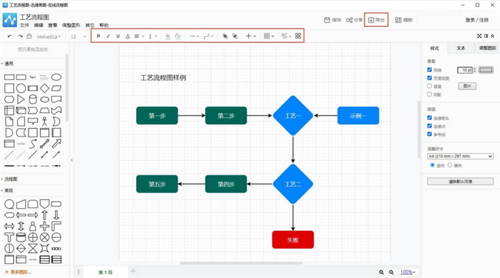 选择想要的模板点击应用之后,我们直接往其中填充文字内容就可以了,如果还想继续扩充内容的话,在左侧有多种图形形状可以添加使用。制作好流程图之后,我们点击“导出”按钮就可以将流程图保存下来啦。