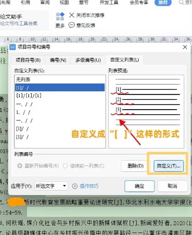 首先,我们要把参考文献前面的序号设置成自动编号,因为论文的参考文献序号格式都是“【】”这个格式,所以你的格式里要是没有的话,就自定义成这个格式;