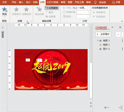(2)圆环动画设置:“动画”菜单-“添加动画”-“进入”之“出现”,设置开始为“单击时”、持续时间自动、延迟0;“动画”菜单-“添加动画”-“强调”之“放大/缩小”,点击动画菜单之“动画窗格”按钮,点击右侧箭头,效果设置尺寸为600%,计时标签中设置开始为“与上一动画同时”、延迟0、期间0.8秒,重复为“到幻灯片末尾”;