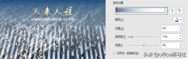 要使突出文字内容的同时让图片某个部分增加页面的表现力,此时使用渐变蒙版就可以弱化图片无关内容的影响,又不影响图片对整个PPT页面的作用。
